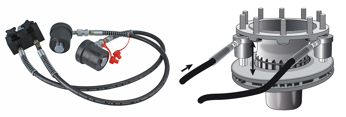 The Laser 8145 Floating Brake Disc Hydraulic Press Kit allows the operator to quickly and easily push off the floating brake discs found on many modern HGV and commercial vehicles. The high-load short rams are designed to sit between the disc and the back of the hub allowing hydraulic force to be applied to push off the disc. The unit is equipped with two control valves (one per ram) to allow the pressure to be applied to either both rams together or one at a time, allowing a useful “rocking” action. Hub/disc unit must be removed from axle before disc removal operation can be carried out. Also suitable for pushing off stuck wheels where access permits.