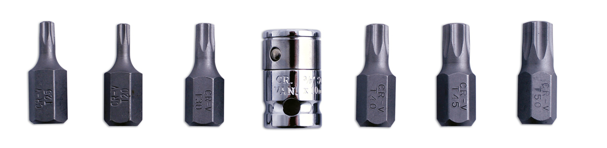 A set of 7 Star* profile bits with 3/8"D bit adaptor.