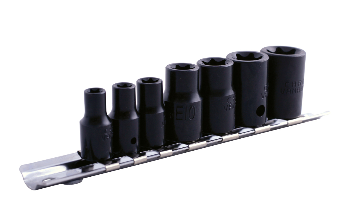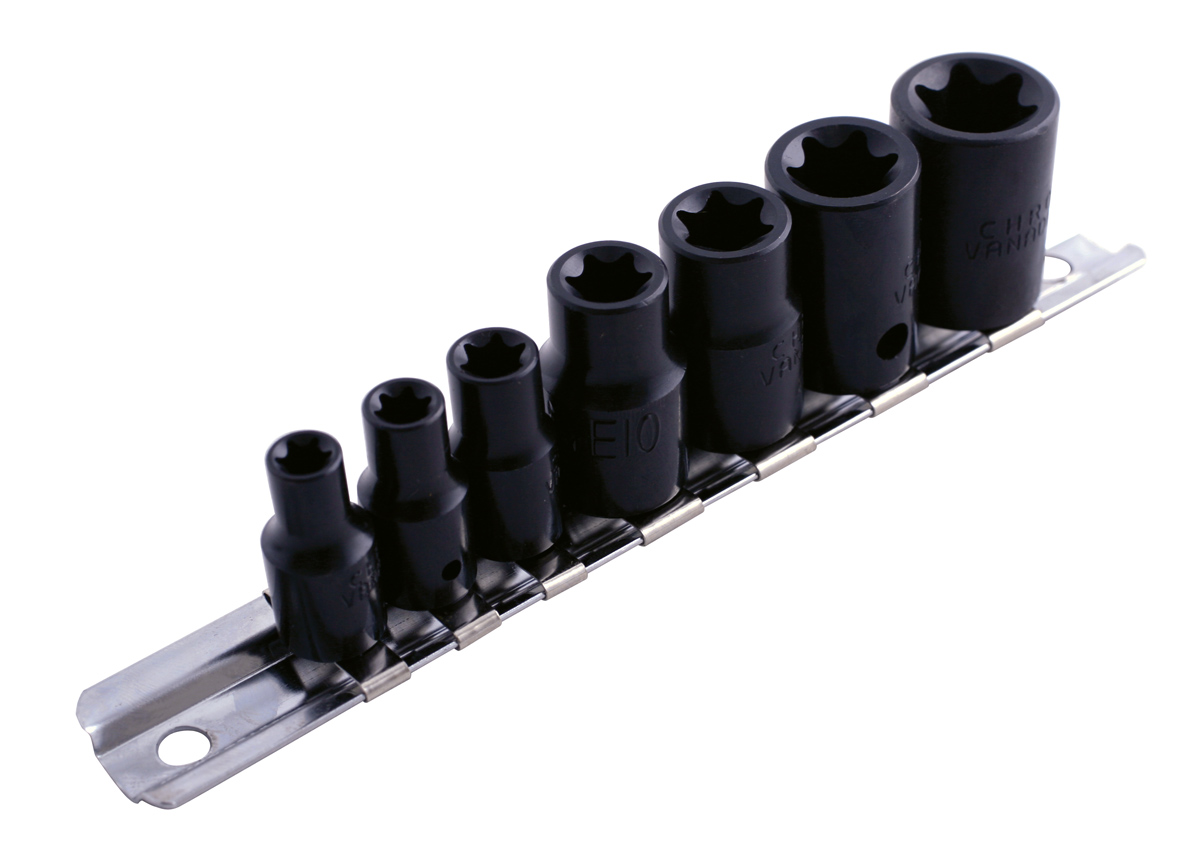 Set of 7 impact sockets in 1/4" square drive and 3/8" square drive with star* profile. A useful compact set of common sizes from E6 to E16. Supplied on a socket rail for convenient storage and easy tool access. Size engraved on each socket for easy identification. Designed for use with impact tools for quick, safe and easy adjustment of star* fixings.