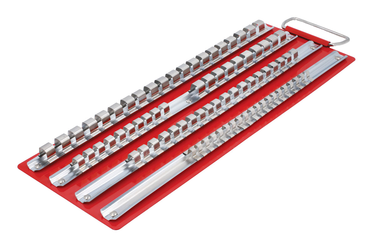 Large socket rail tray in red gloss finish for storing up to 80 sockets in the most popular drive sizes, 1/2"D, 3/8"D and 1/4"D. An excellent way to organise a large number of sockets, featuring adjustable spring clips for easy, accessible storage. Durable steel construction with top handle for carrying or wall hanging.