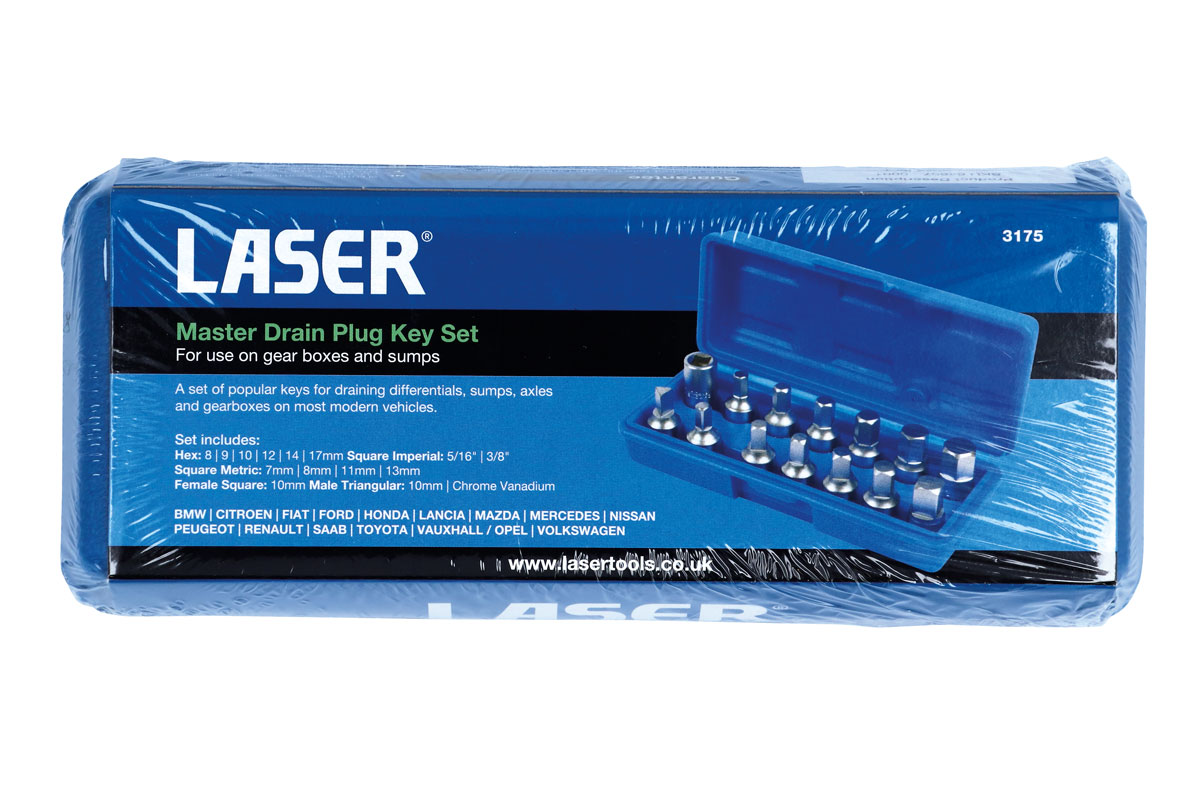 A set of popular keys suitable for the removal of drain and filler plugs on engine oil sumps, back axles, differentials and gearboxes on most modern vehicles.