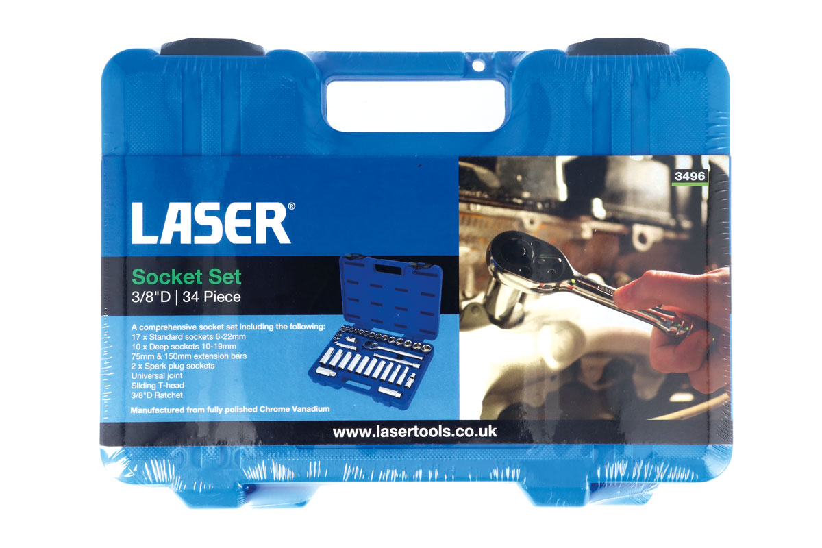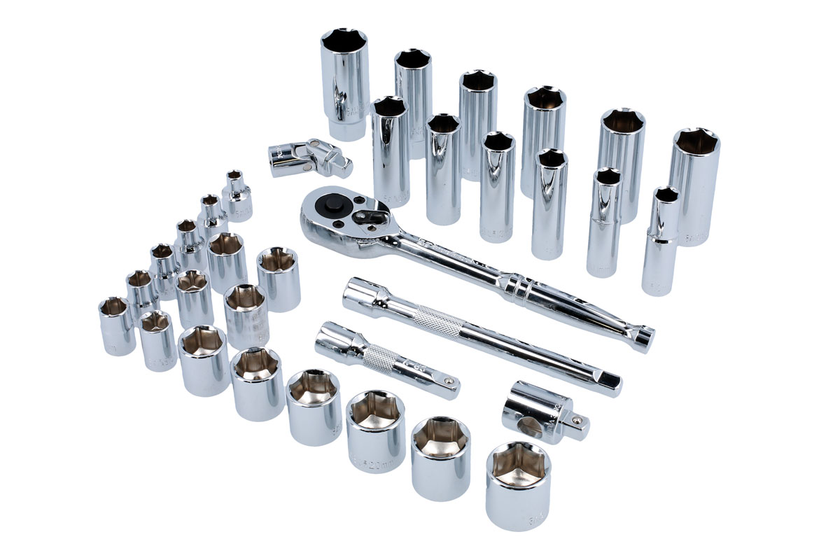 A comprehensive set of 3/8"D standard and deep single Hex (6pt) sockets, in a full range of sizes from 6mm to 22mm, manufactured from polished chrome vanadium. The set comes complete with accessories including a 45-tooth reversible ratchet, a pair of extension bars, a sliding T-bar and universal joint, all packed in a blow mold storage case. A versatile kit, includes standard, deep access and spark plug sockets, covering the majority of servicing and maintenance jobs.