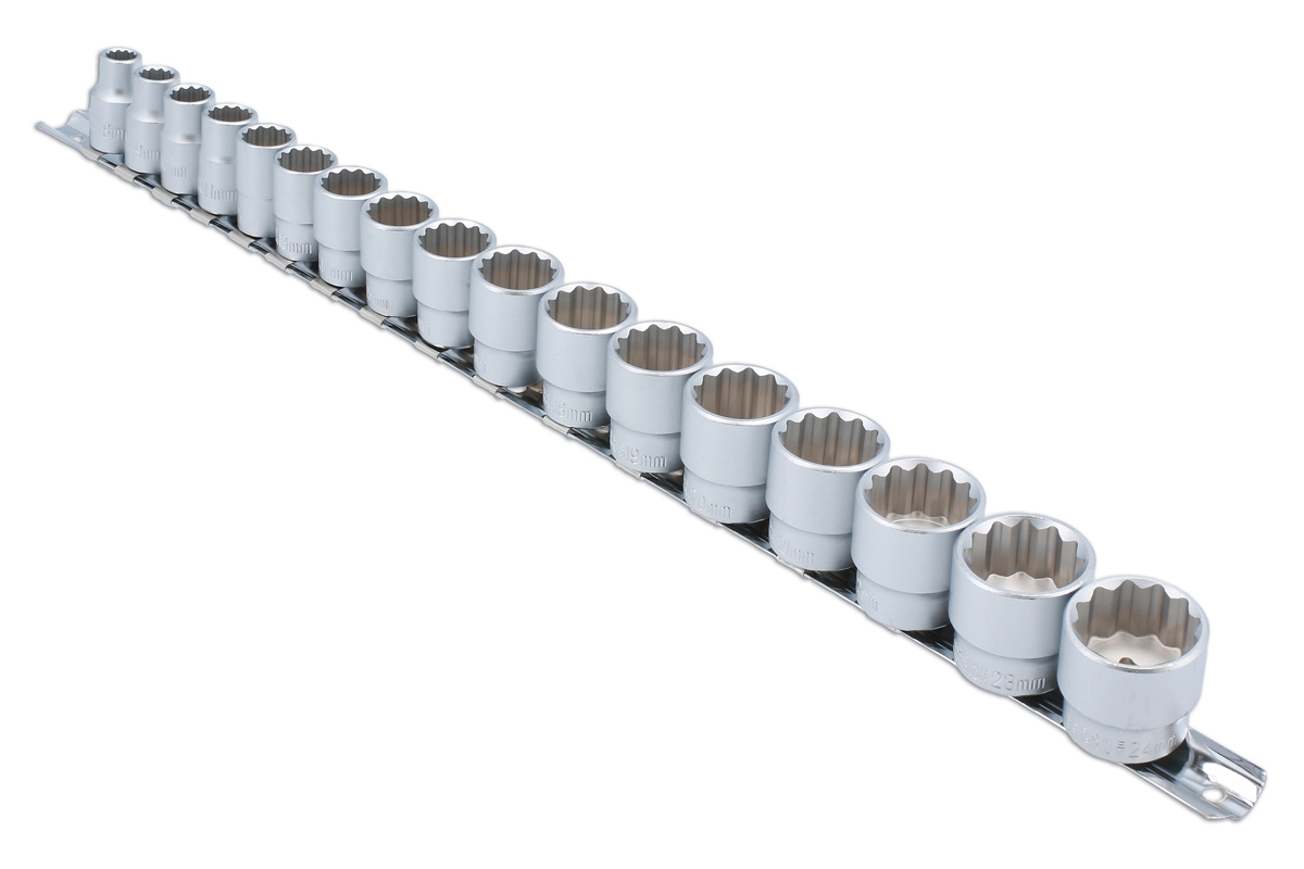 Complete set of Bi-Hex (12pt) 3/8"D sockets in a useful range of sizes from 8mm to 24mm. Bi-Hex head provides 12 points of potential contact making it quicker and easier to seat the socket over most types of fastener, including square-head nuts and bolts. The size is engraved on each socket for easy identification. A quality set manufactured from satin finish chrome vanadium supplied on a socket rail for convenient storage and easy tool access.