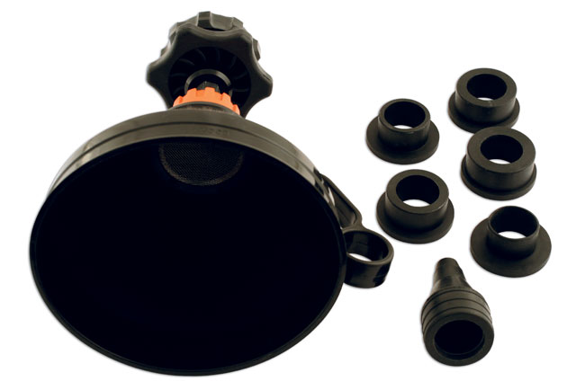 A universal sealed coolant filing system that ensures quick, clean results every time. The funnel features a shut off valve lever to stop coolant flow when the system is full and there is an additional head to help purge air locks. There is a mesh filter at the base of the funnel and an ergonomic side handle with a thumb and finger grip for a secure hold. This comprehensive set includes five adaptors; 31, 35, 40, 42 and 45mm as well as a cone for Japanese cars, making it suitable for a large number of vehicle makes and models. A clever design that makes an awkward job quick and easy and reduces coolant spillage, ideal for the professional workshop.