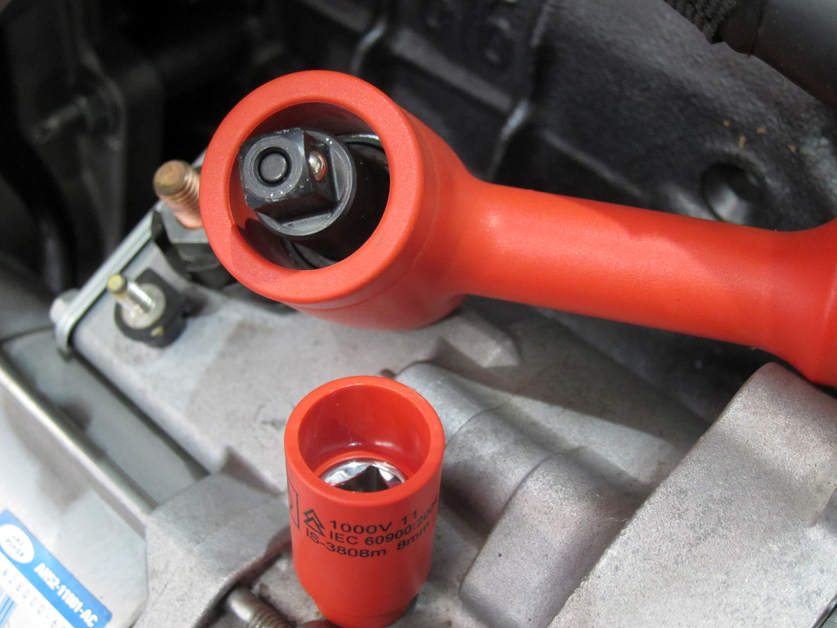 Fully insulated socket set, for live working up to 1000V AC / 1500V DC, ideal for hybrid and EV servicing and maintenance. The fourteen Bi-Hex (12pt) 3/8"D sockets cover all sizes from 6mm and 19mm and the set comes with a useful range of accessories including a 3/8"D 45 teeth ratchet with quick release and two extension bars (150mm and 250mm). All the tools are fully insulated to VDE/GS and IEC60900 standards, approved for work up to 1000V and the set comes in a blow mold case for safe storage.