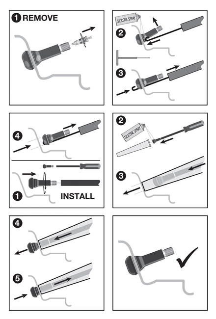 - The hook is used to remove the old valve body; the screw tool and tapered tube are used for fitting. Lubricate with tyre lube or similar.