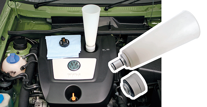 The aluminium adaptor fits the Mercedes Benz Sprinter with M112 and 113 engines, BMW six and eight cylinder engines from 1996 and VAG engines from 1.8 litres and upwards. The funnel has a one litre capacity.