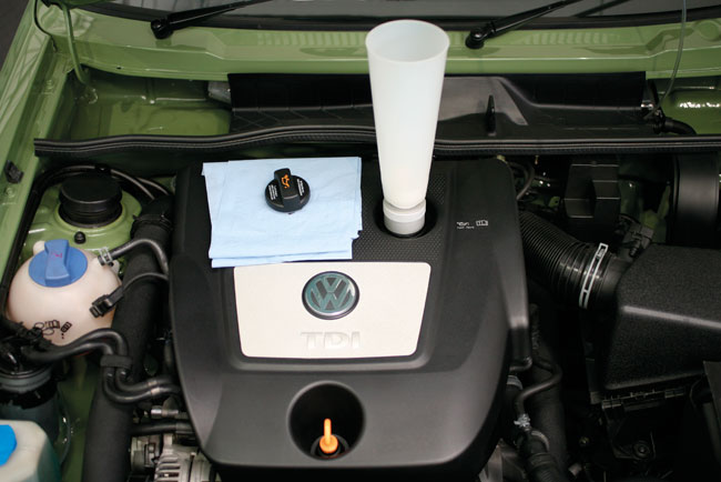 Purpose-designed oil funnel prevents spillage onto engine and manifolds