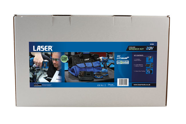 Part of the Laser Tools cordless tools range, this is an ideal starter kit comprising of the impact wrench 1/2”D and key accessories required. This impact wrench delivers a comfort grip, variable power control and an intelligent circuit board giving prolonged life. Features include metal gears and a maximum torque 300Nm, a fixed belt clip holder and an LED light to enhance workspace. Also supplied are two 20V 4.0Ah batteries allowing professional users to run one whilst one charges giving uninterrupted use, a 230V 4 amp mains battery charger (euro plug) and heavy duty storage bag. CE & RoHS compliant.