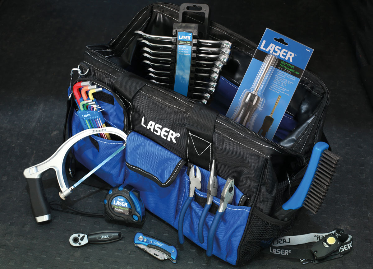 Revolutionise your toolkit with this comprehensive tool bag kit from Laser Tools, a portable powerhouse for automotive enthusiasts (part number 61719). This 63-piece set encompasses an array of essentials, from wrenches and socket drivers to hex keys, pliers, and much more. The package includes must-haves like a tape measure, utility knife, hacksaw, and wire brush, all neatly organized in an 18" heavy-duty tool bag. No more missing tools — everything you need is in one convenient kit.
