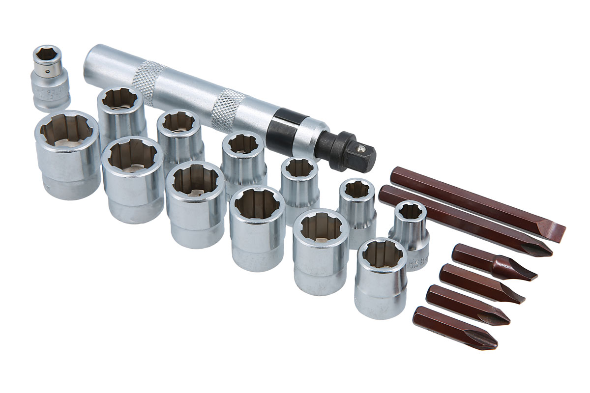 For the removal of damaged, rusted or rounded off nuts and bolts as well as for removing rusted screws in hard to reach places. The sockets have a fluted design and are suitable for AF/metric sizes.