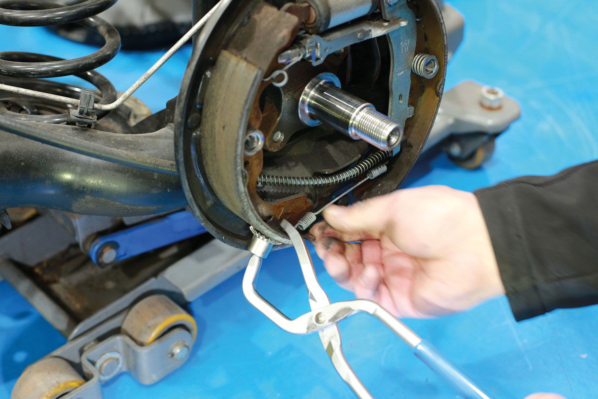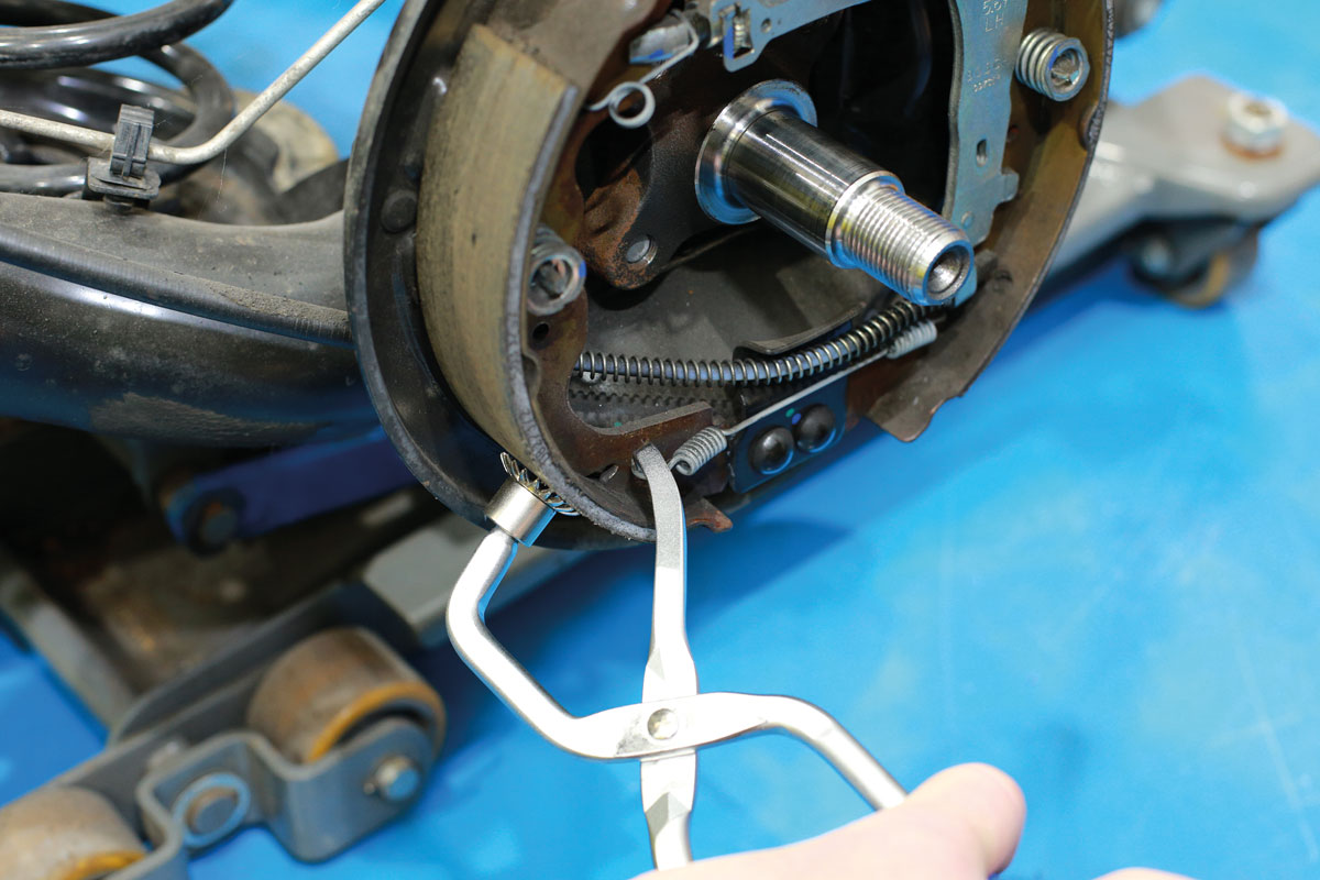 - Ein Ende wird auf die Feder gehakt, das andere Ende greift den Bremsbelag, der auf der Bremsbacke befestigt ist