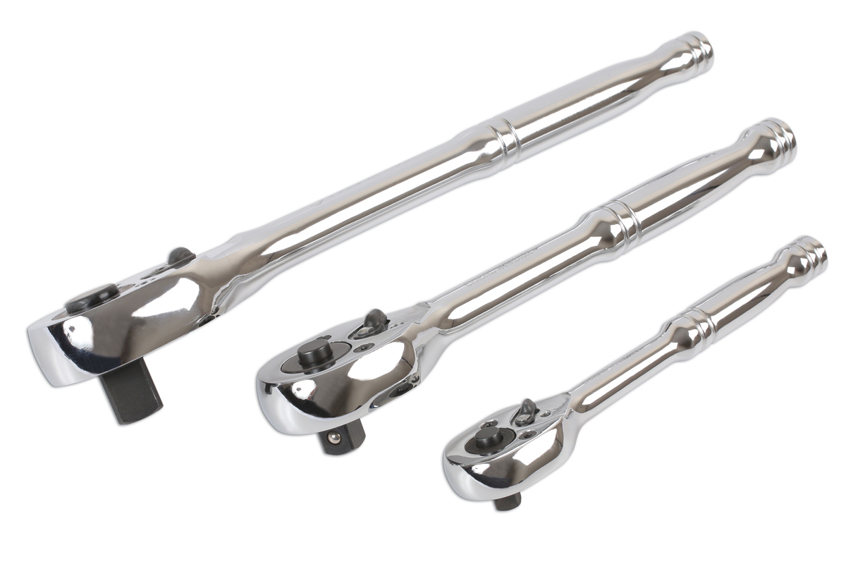 A set of standard ratchets in 3 drive sizes with reversible action and quick release, manufactured from polished chrome vanadium.