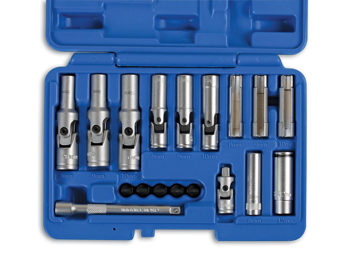 - Ein Satz mit 3 geteilten Steckschlüsseln für Glühkerzen, für den Fall, dass die Kabel am besten verbunden bleiben, z. B. bei einigen Motoren von Alfa Romeo/Fiat oder GM.
