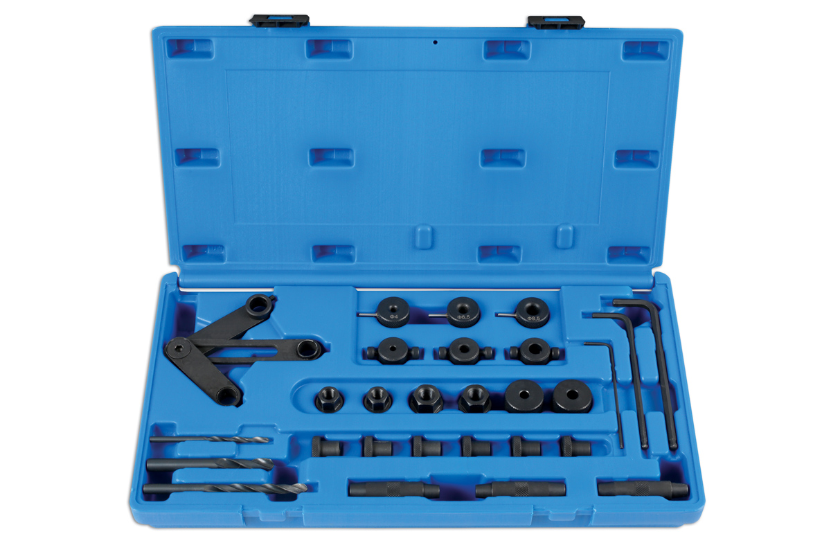 Drilling out a broken stud is an exercise fraught with danger; if the drill does not go in 100% straight and parallel to the stud, the internal threads can be drilled through or worse, the cylinder head or gearbox casing can be left expensively damaged. This new kit from Laser Tools (part number 6587), allows the user to correctly and safely drill out broken M8 and M10 studs and bolts. Ideal for use on exhaust manifolds, inlet manifolds, cylinder heads, gearboxes, differentials, etc, where stud size and spacing allows access.