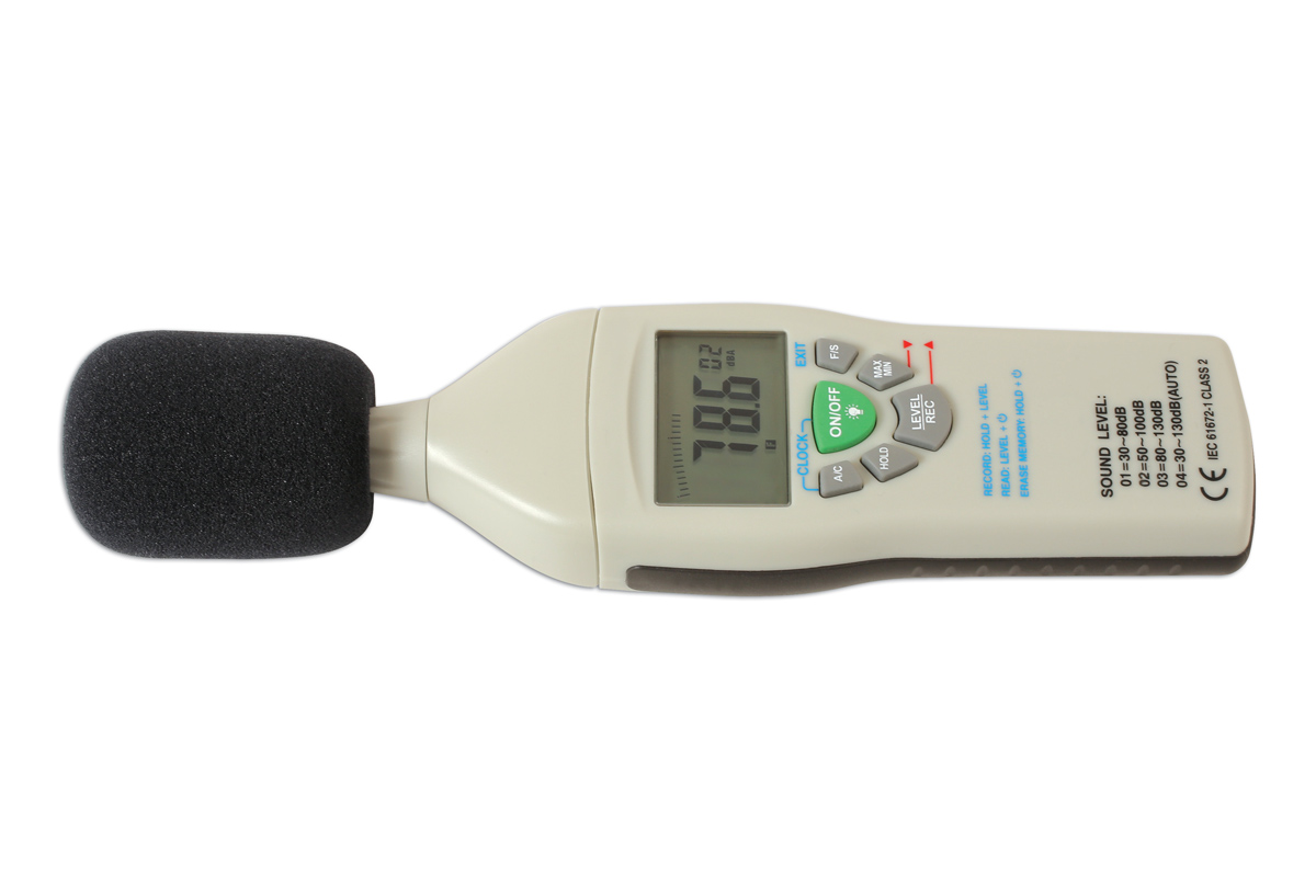 The device is fully featured, including a hold function, Max and Min functions (where the maximum or minimum sound level is captured and held until a high (or lower) sound is captured, and it can record and save up to 80 readings. The included wind shield is used to gain accurate sound captures in windy conditions and avoid background noise.