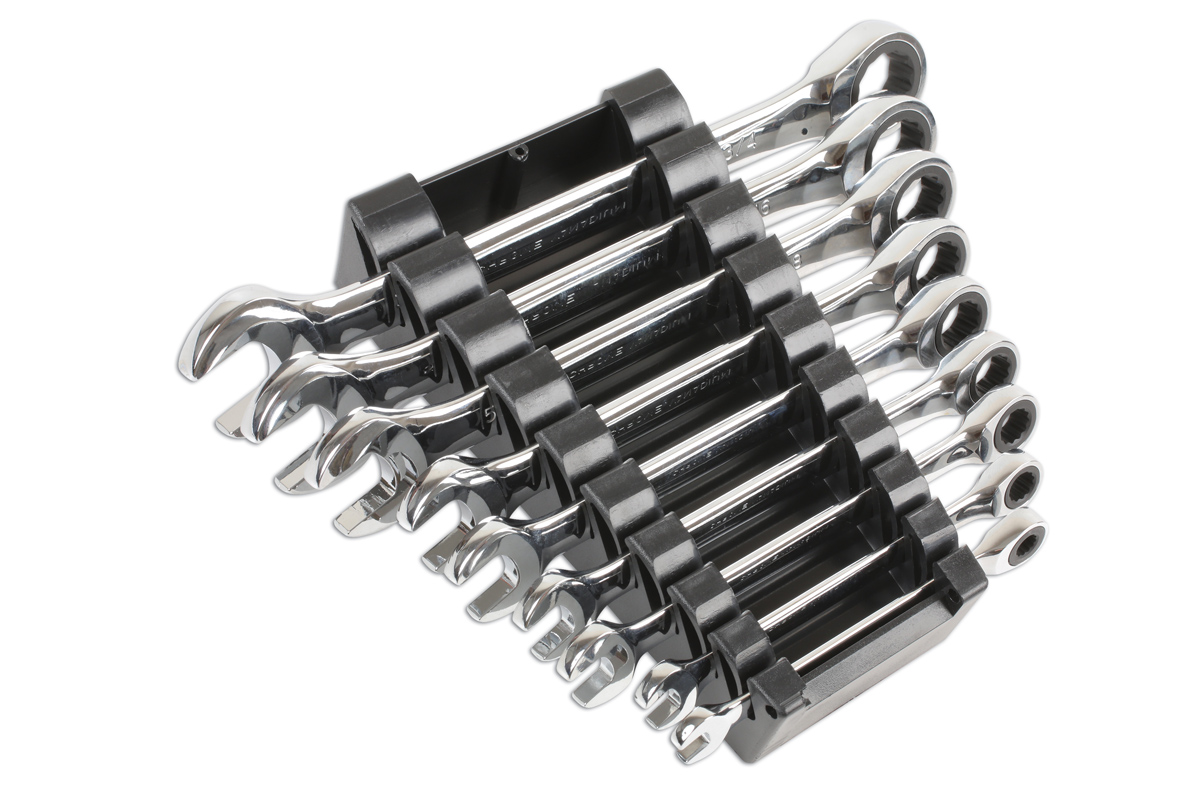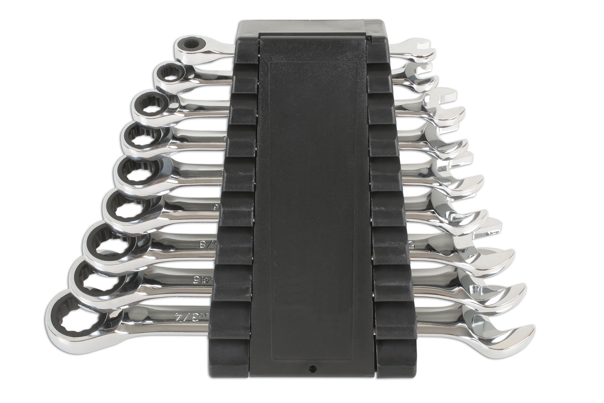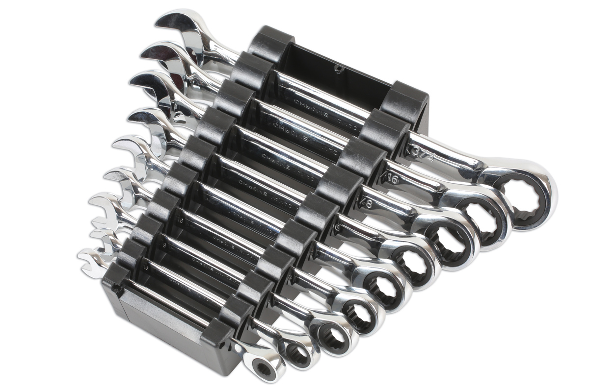 Ratcheting spanners are ideal for use in areas with restricted access, and this high-quality 9-piece AF combination ring/open-ended set from Laser Tools (part number 6699) boasts smooth 72-tooth ratchet mechanisms that make them a pleasure to use.