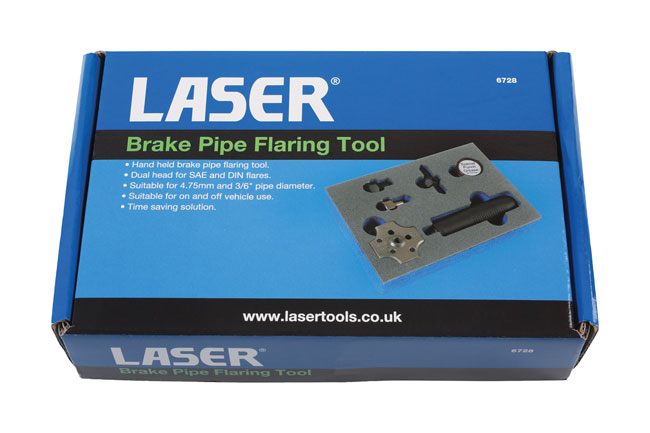 Compact, hand-held brake pipe flaring tool for convenient on-vehicle brake pipe repair and maintenance even when access is restricted. The tool has a dual head for creating both DIN single flares and SAE double flares and the flare type is clearly marked for easy identification. Simple to use, a stop-plug sets the correct length of pipe and the flare is formed by turning the punch into the cast body to compress the pipe end. The set includes dies and punches for the two most common brake pipe sizes (4.75mm and 3/16") as well as a pot of punch grease. A robust, quality tool engineered to produce precision flares every time.