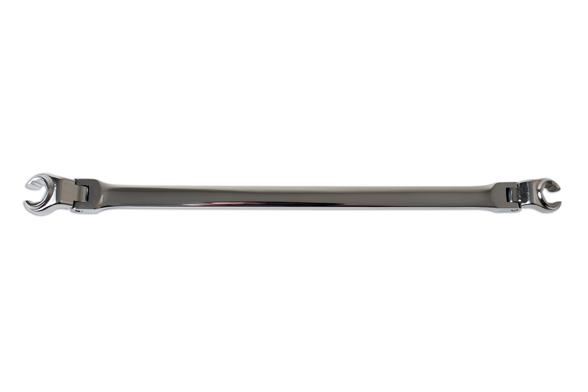Extra long, double ended flexible flare nut wrench provides greater access to hard to reach areas.