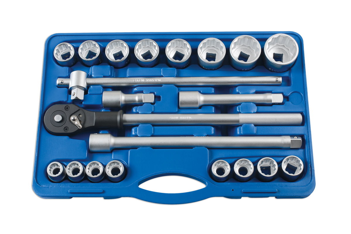 A comprehensive 3/4"D Bi-Hex (12pt) socket set, from 19mm to 50mm, with heavy-duty ratchet and accessories.