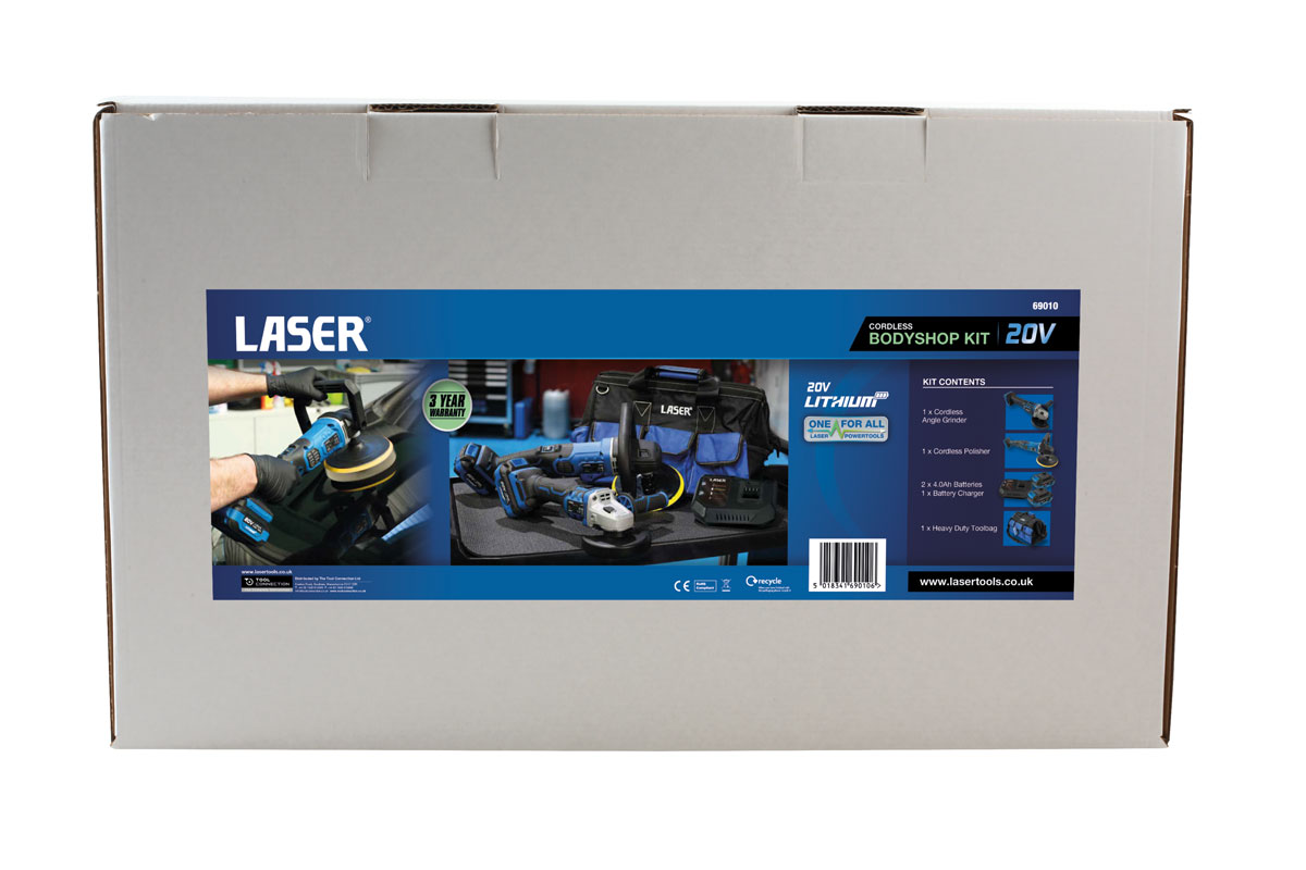 A set of cordless power tools and accessories specifically selected for bodyshop use. Featuring two of the most popular and productive tools for the bodyshop - a cordless grinder for use with either flat or depressed centre 115mm cutting and grinding discs and a cordless 4-speed polisher for use with M14 compounding and polishing heads. Ideal for all types of surface treatment, from rough cutting/grinding, to final finish and polishing. Also supplied are two 20V 4.0Ah batteries allowing professional users to run one whilst one charges giving uninterrupted use, a 230V 4 amp mains battery charger with BS (UK) plug and heavy duty storage bag. CE & RoHS compliant.