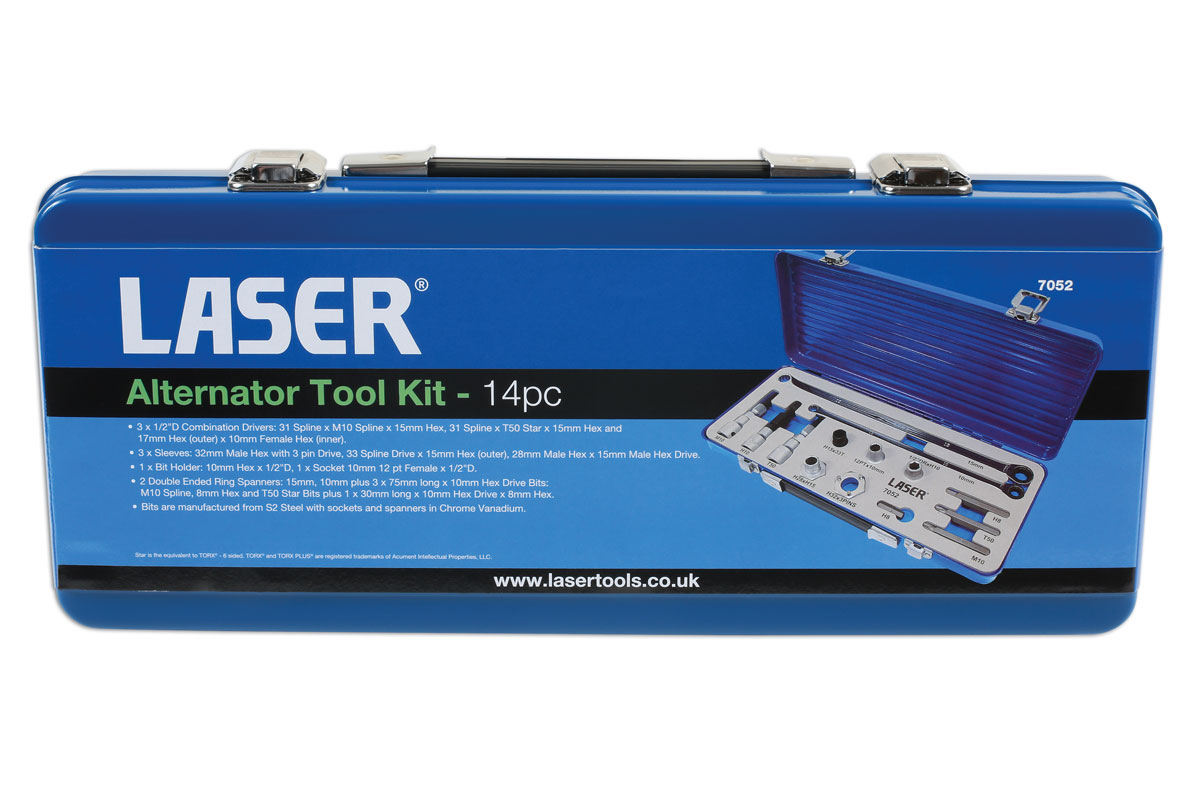 An alternator pulley holding and removal kit for Denso, Valeo, Bosch and Marelli alternators.