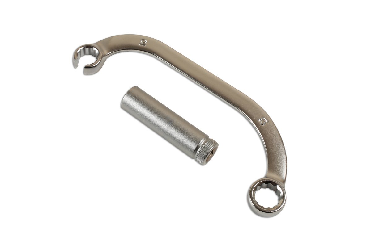 Specially designed spanner and split deep socket to assist in the removal, fitting and adjustment of the turbo pressure capsule and turbo actuator on VAG engines.