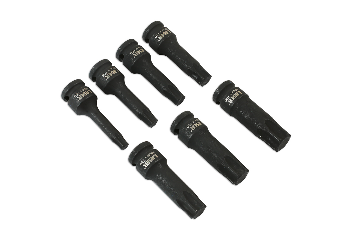 Long series, heavy duty impact Star* 1/2"D socket bit set from T50 to T100.