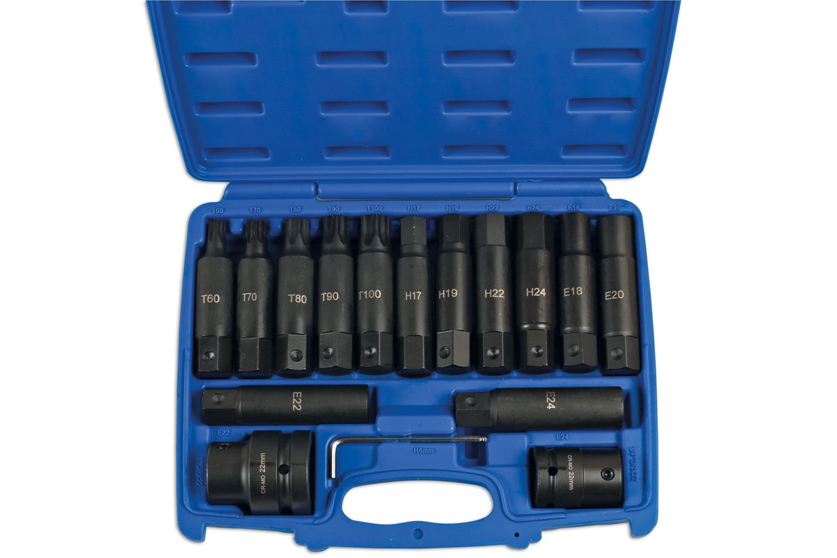 A dual 3/4" and 1" square drive impact socket and bit set that includes a comprehensive selection of hex, star* and 'E' profiles. Ideal for commercial vehicle maintenance and other heavy-duty applications. A high-quality set designed for impact driving with large, clear to read size markings for easy identification. Supplied in a robust carry case (250mm x 305mm) for secure, portable tool storage. A useful kit for the safe and fast adjustment of a wide range of fixings.