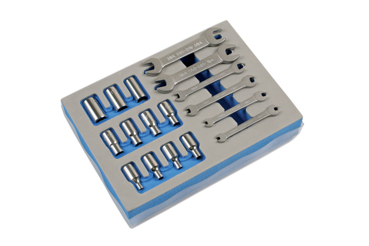 This useful set from Laser Tools incudes 11 1/4"-drive sockets manufactured from tough chrome vanadium steel: OBA, 1BA, 2BA, 3BA, 4BA, 5BA, 6BA, 7BA, 8BA, 9BA and 10BA. The six open-ended spanners are sized at 0BA x 2BA, 1BA x 3BA, 4BA x 6BA, 5BA x 7BA, 8BA x 10BA and 9BA x 11BA.