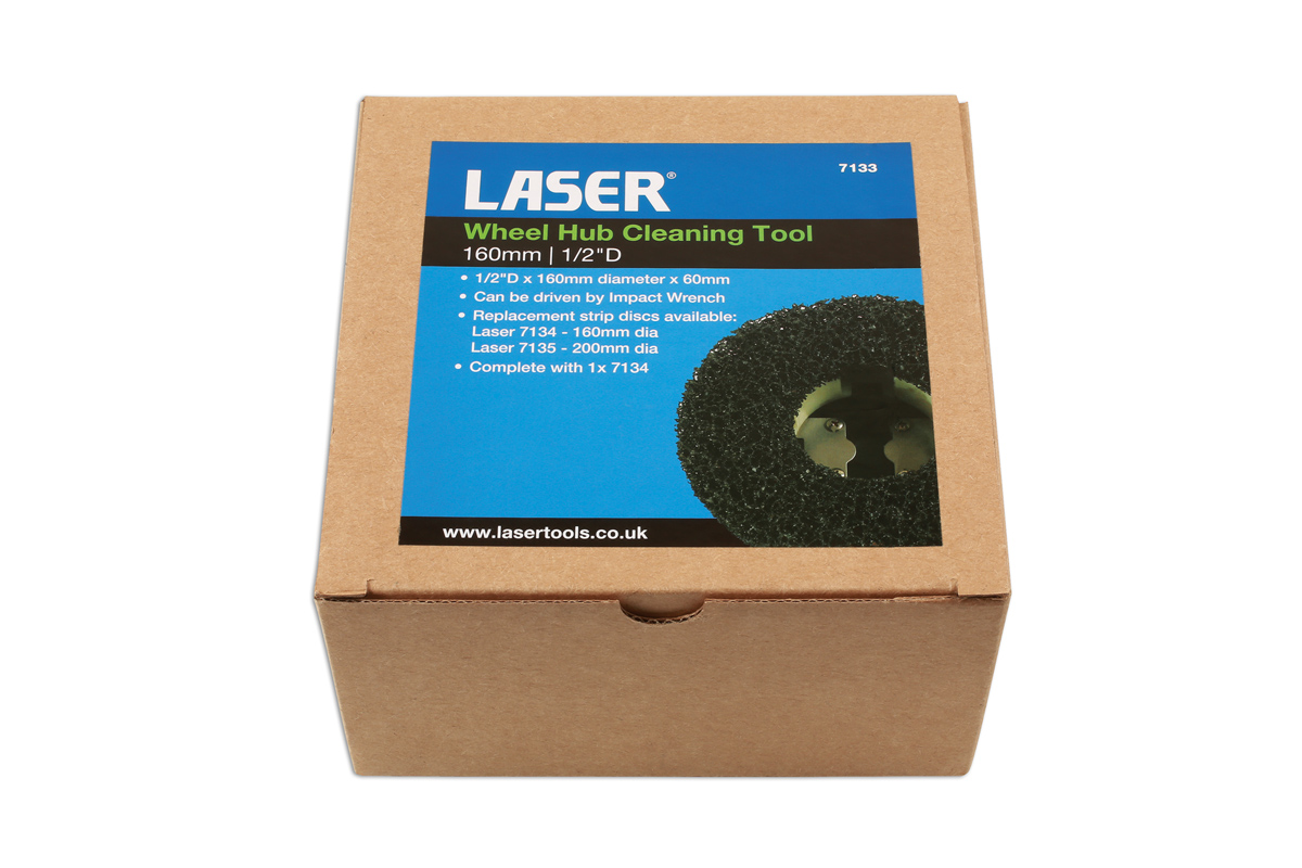 The 7133 hub cleaning tool is designed for cleaning the studless hubs found on most European cars and car derived vans. It has a 1/2" square drive allowing it to be driven by the same power tools used to remove the wheel taking away the need for electric drills or any additional tooling. The 7133 comes equipped with a replaceable 160mm diameter cleaning disc making it ideal for most car hubs with a centre boss diameter up to 64mm and for cleaning the mating surface on the inside of both steel and aluminium wheels. For best results and longer pad life a light pressure is all that is required.