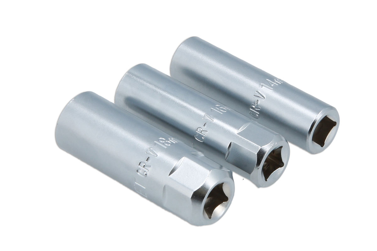 A set of three super-slim spark plug sockets that feature very thin walls to fit the narrow spark plug recesses often found in modern vehicles. Manufactured from chrome vanadium steel for strength and durability, they also feature a rubber insert to grip the spark plug safely.