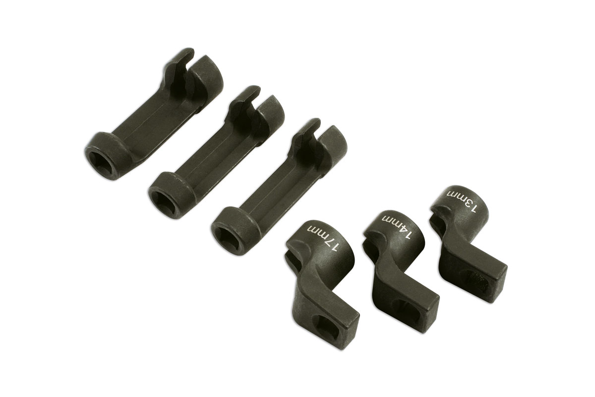 Satz Steckschlüssel für Abgastemperatursensoren, gerade und gekröpfte Versionen. Dient zum Ausbau von Abgastemperatursensoren der Größe 13/14/17 mm