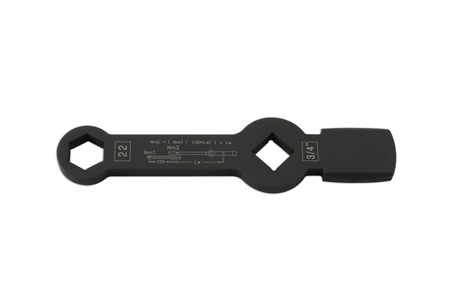 These wrenches are all a 6-point single-hex design and manufactured from S45C steel (hardness HRC 38-42), with a black phosphate finish. Designed to be used with a heavy hammer, the combination of wrench and hammering action provides a powerful and effective method for tackling tough or stubborn fasteners. Additionally, they can be used with a 3/4" drive for tightening, and if using a torque-wrench, a handy torque correction-factor formula is etched onto the side of the wrench.