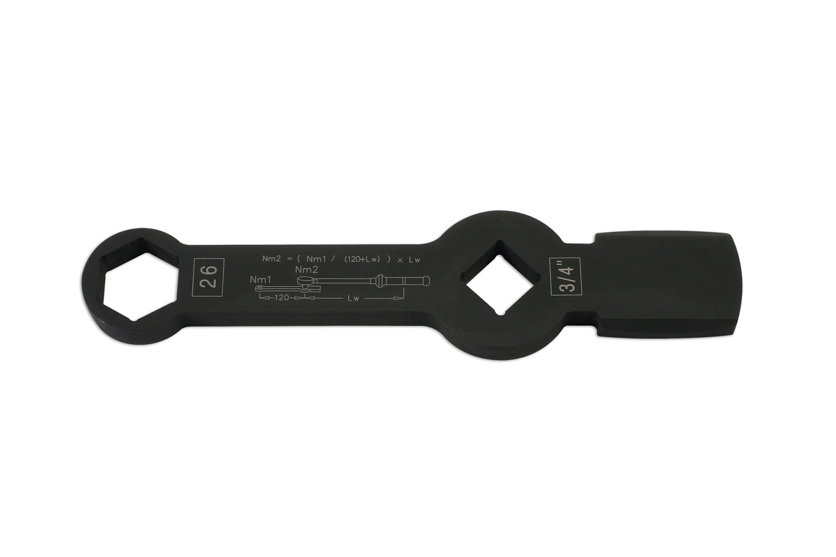These wrenches are all a 6-point single-hex design and manufactured from S45C steel (hardness HRC 38-42), with a black phosphate finish. Designed to be used with a heavy hammer, the combination of wrench and hammering action provides a powerful and effective method for tackling tough or stubborn fasteners. Additionally, they can be used with a 3/4" drive for tightening, and if using a torque-wrench, a handy torque correction-factor formula is etched onto the side of the wrench.