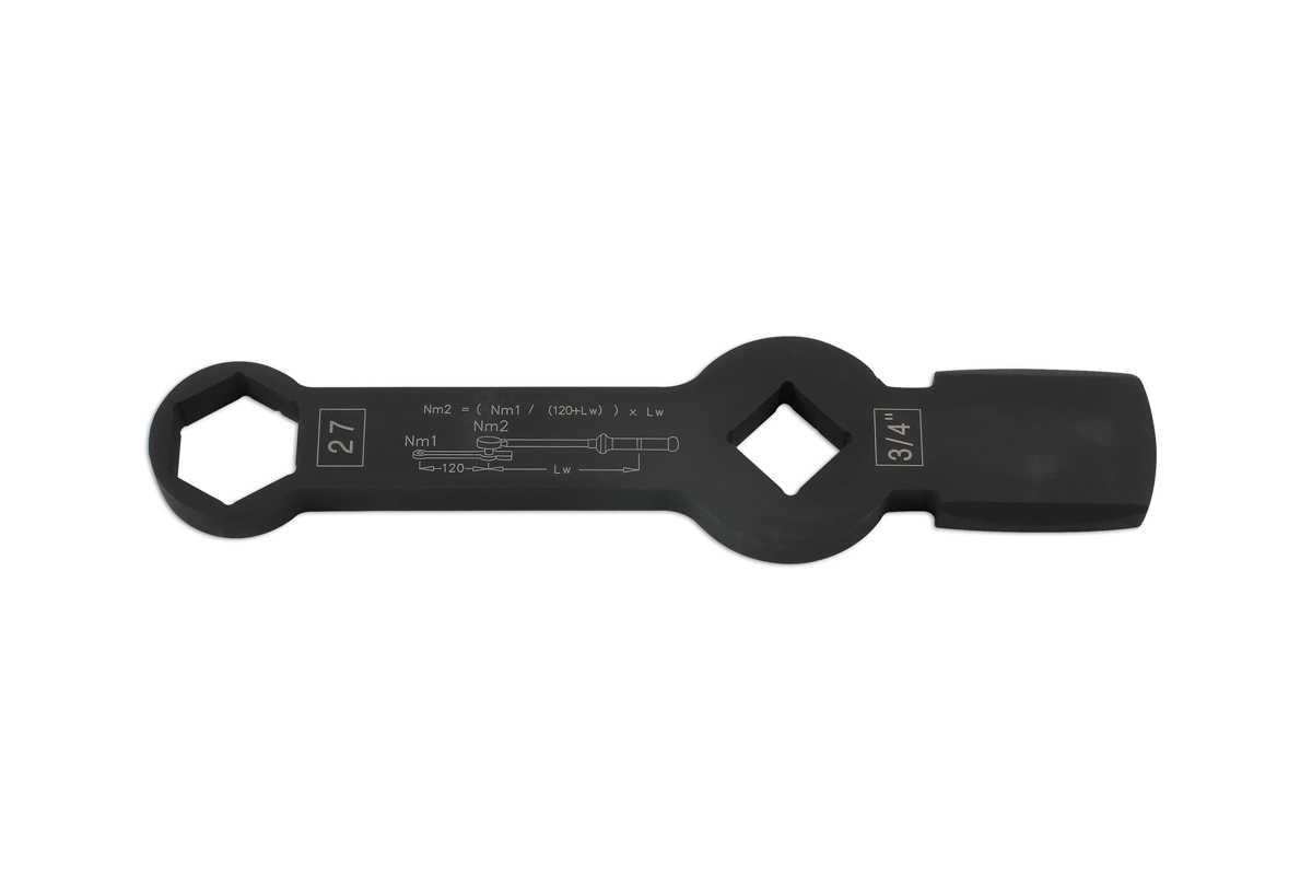 These wrenches are all a 6-point single-hex design and manufactured from S45C steel (hardness HRC 38-42), with a black phosphate finish. Designed to be used with a heavy hammer, the combination of wrench and hammering action provides a powerful and effective method for tackling tough or stubborn fasteners. Additionally, they can be used with a 3/4" drive for tightening, and if using a torque-wrench, a handy torque correction-factor formula is etched onto the side of the wrench.