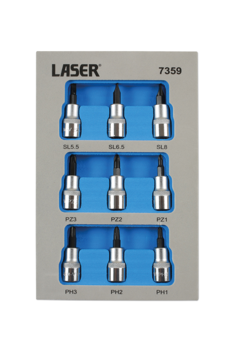 Jeu de douilles à embout de 9 pièces à carré de 3/8" x 50 mm de longueur Ph1/Ph2/Ph3/Pz1/Pz2/Pz3/ plat 5,5 mm, 6 mm, 8 mm