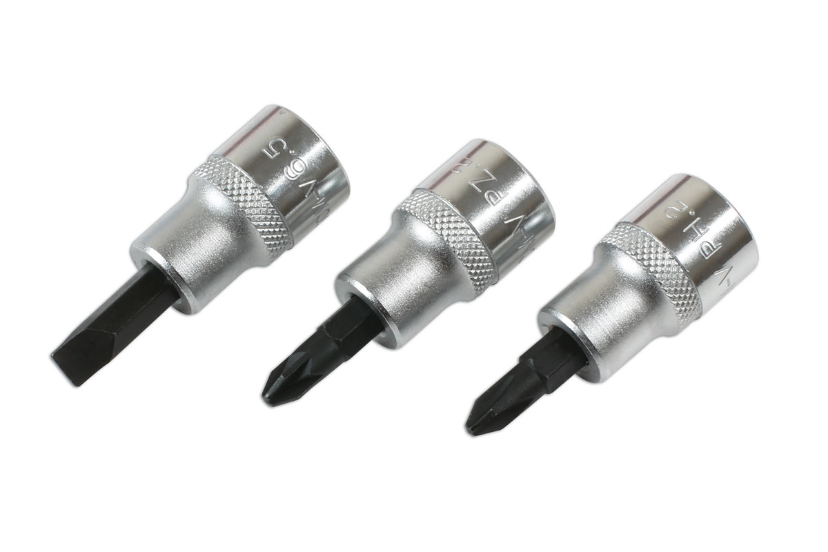 - 3/8"D socket bits: Phillips Ph1, Ph2 and Ph3; Flat 5.5, 6.5 and 8mm; PzDrive Pz1, Pz2 and Pz3.