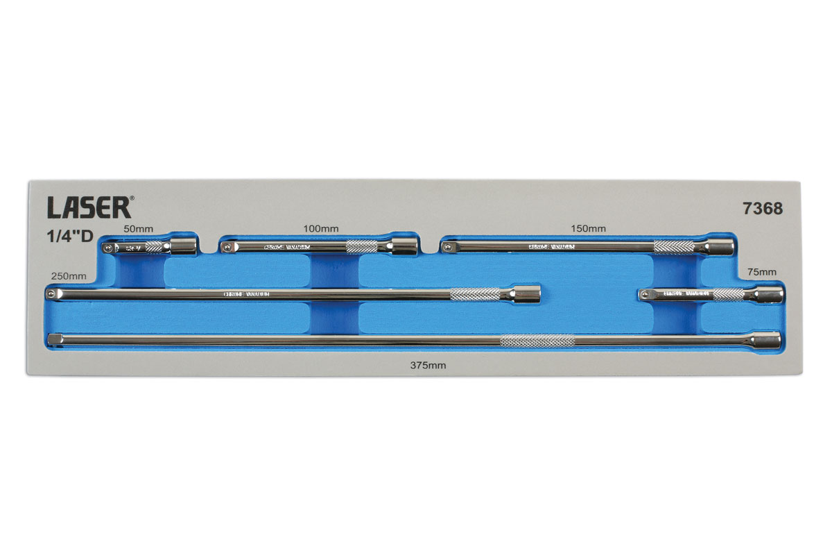Jeu de rallonges de six pièces à carré de 1/4", contient des rallonges de 50/75/100/150/250/350 mm de longueur avec barres moletées pour une meilleure prise