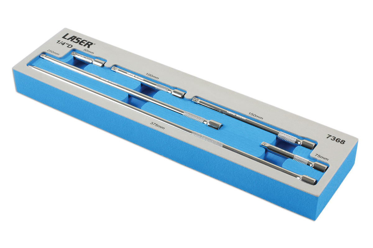 Sechsteiliger Verlängerungssatz mit 1/4"-Antrieb enthält Stangen in Längen 50/75/100/150/250/350 mm mit Rändelung für besseren Griff