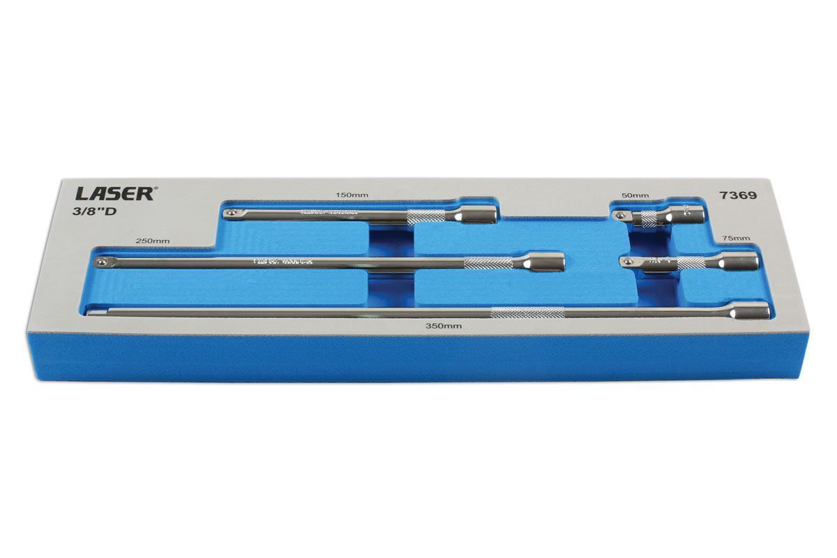 Fünfteiliger Verlängerungssatz mit 3/8"-Antrieb in enthält Stangen in Längen 50/75/150/250/350 mm mit Rändelung für besseren Griff