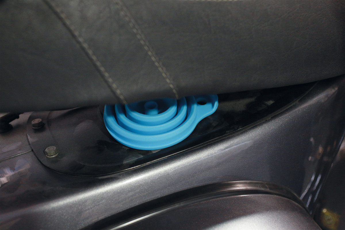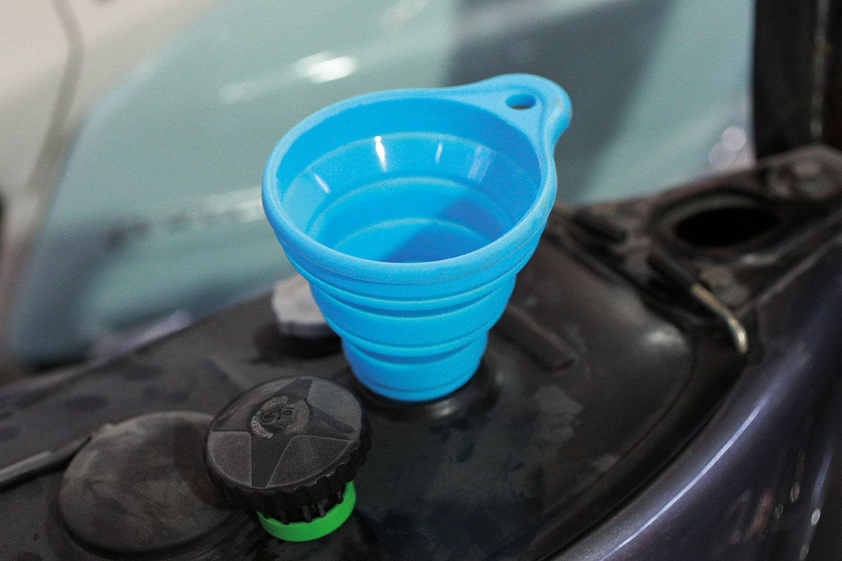 Collapsible silicone funnel, diameter 100mm, suitable for use with petrol, diesel, brake fluid, gear oil, antifreeze and AdBlue®. A unique design that folds flat, ideal for under seat storage on motorcycles. Indispensable for quick top-up jobs when out on the road. Thick, flexible, easy clean silicone, that is heat resistant making it also suitable for kitchen use.