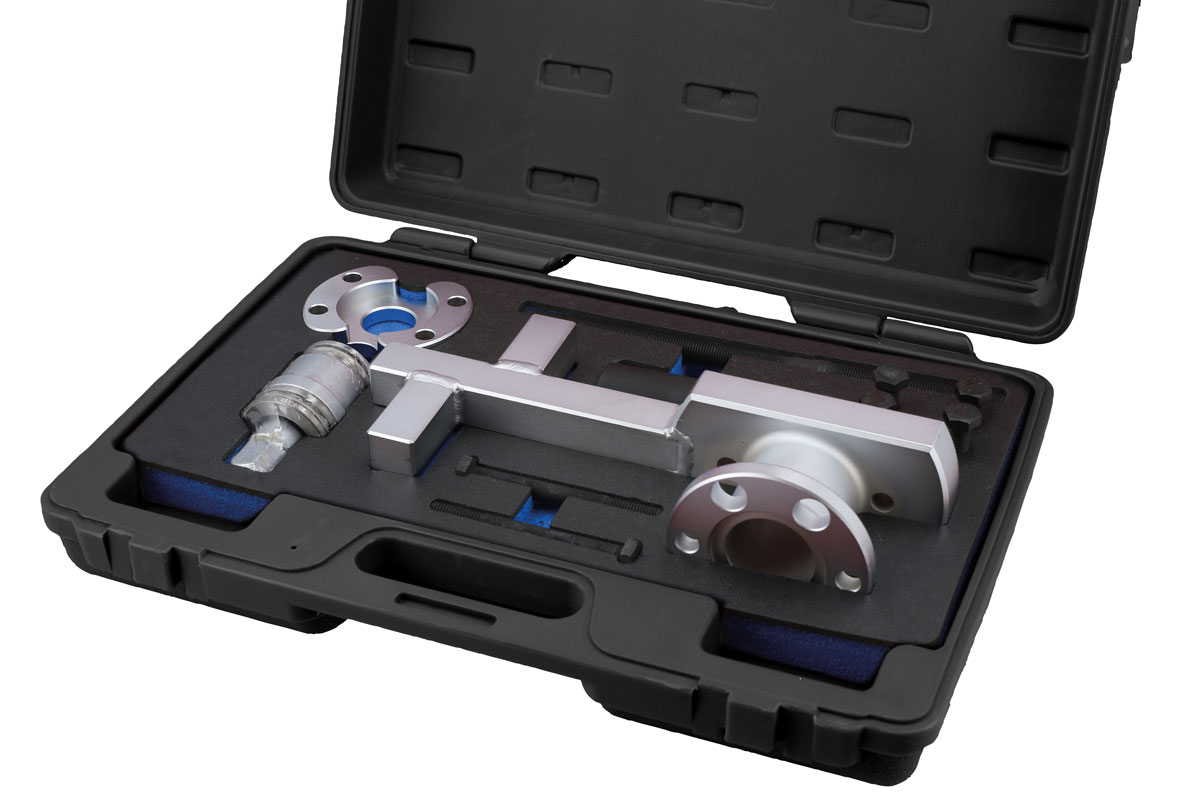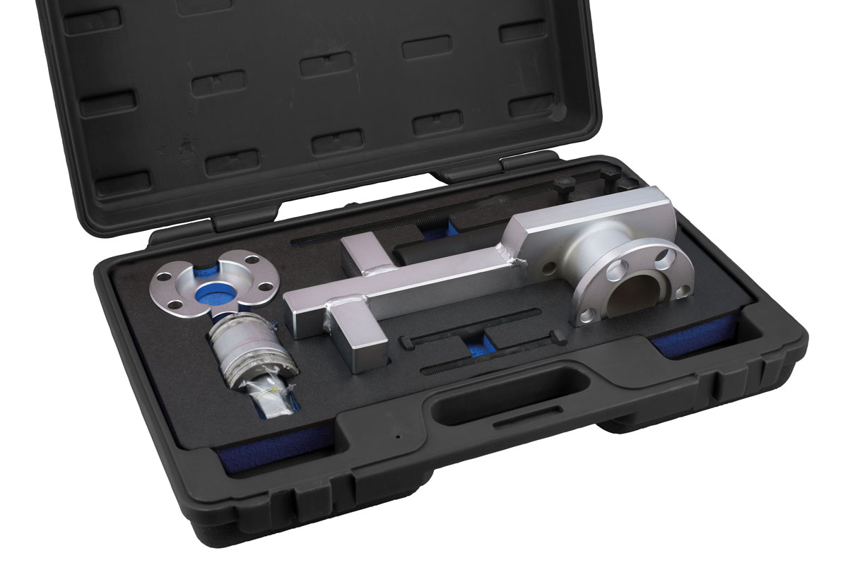 7415 ist der Werkzeugsatz, der für die Demontage der vorderen Kurbelwellenscheibe (Kurbelwellenvibrationsdämpfer) von 3,0-l-V6- und 5,0-l-V8-Benzinmotoren von Jaguar und Land Rover erforderlich ist. Die bei diesen Motoren verwendeten Kurbelwellenscheiben sind mit 200 Nm + 270 Grad festgezogen und deshalb schwierig zu lösen. Sie müssen von einem kräftigen Haltewerkzeug gehalten werden, das im Satz enthalten ist. Außerdem Teil des Lieferumfangs sind die Abzieherkomponenten, die zum Entfernen der Riemenscheibe ohne Beschädigung benötigt werden.
