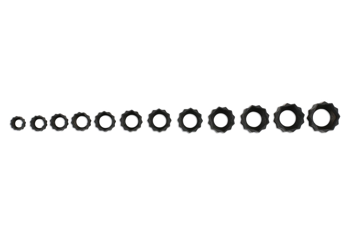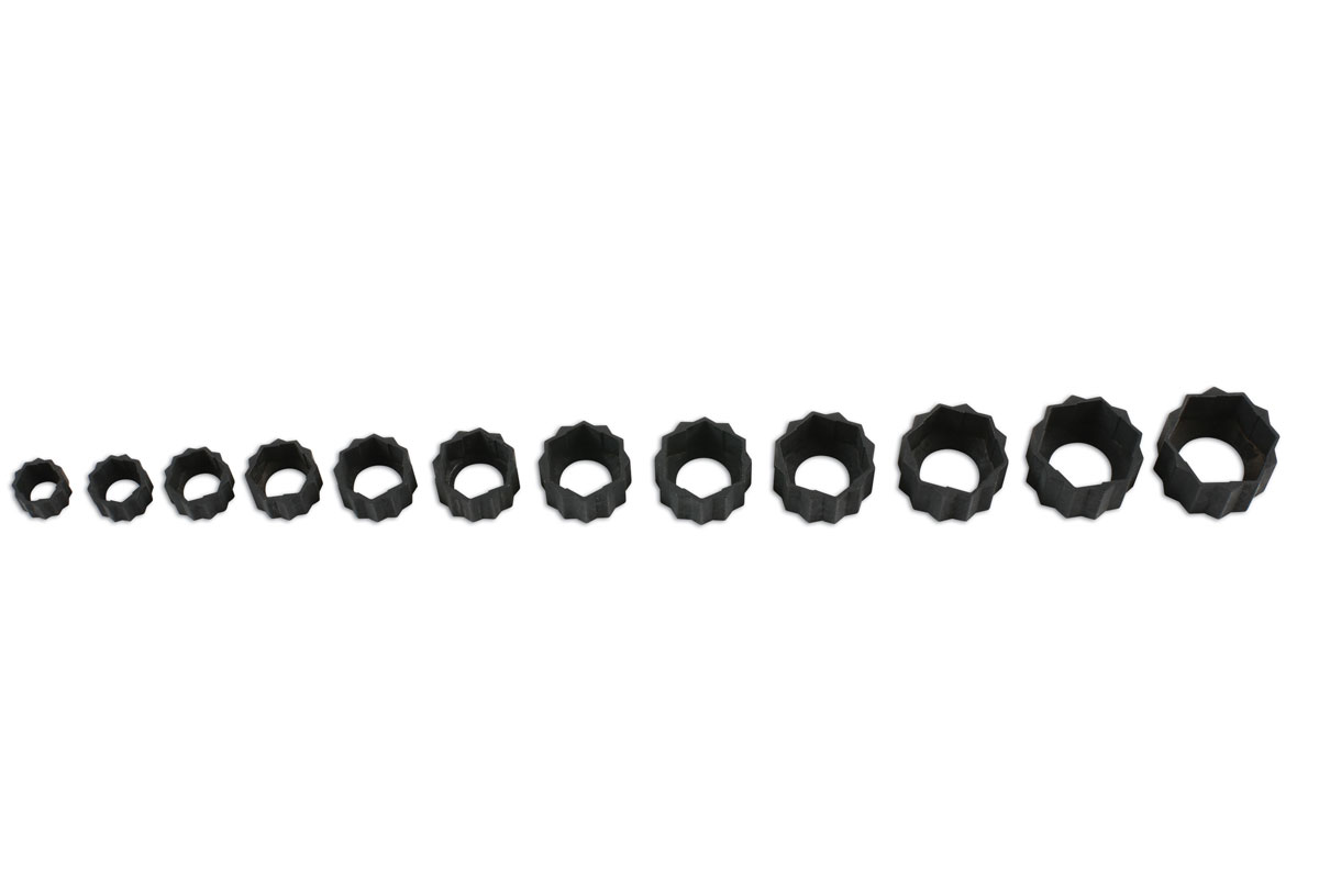 There are 12 sizes included in the set: 8mm, 9mm, 10mm, 11mm, 12mm, 13mm, 14mm, 15mm, 16mm, 17mm, 18mm and 19mm. For lightly rounded-off fasteners the caps can used again and again, but for more damaged fasteners the caps are classed as consumable items (replacements parts are available to keep your set complete).