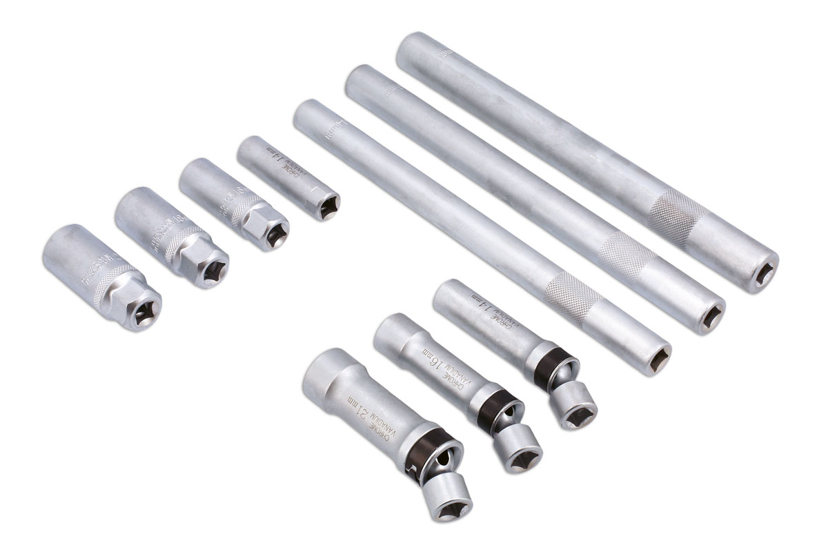 - Ein umfassender Satz aus 10 Zündkerzensteckschlüsseln mit Gummieinsätzen zum Schutz und Greifen der Zündkerze. Aus Chrom-Vanadium-Stahl.