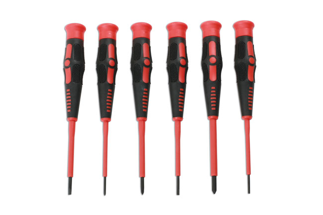- Jeu de six pièces de tournevis électroniques certifiés VDE avec profils Phillips et plat.
