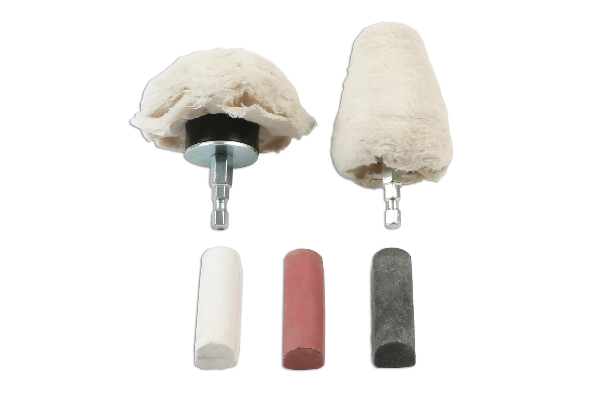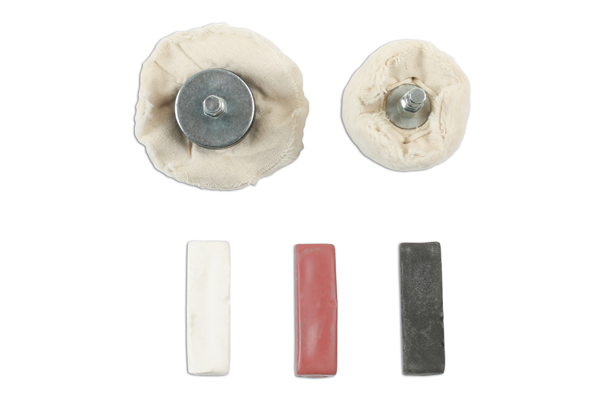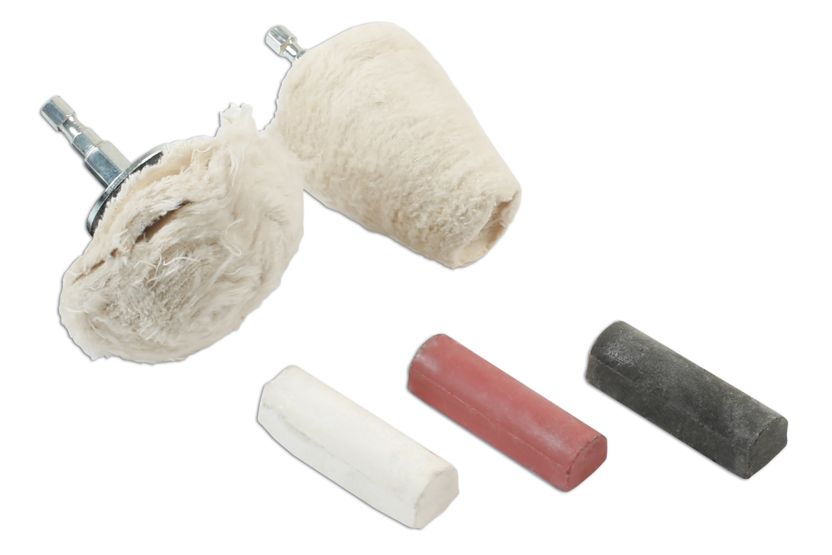 - Round cotton buff 75mm diameter; tapered cotton buff 50mm x 50mm.
