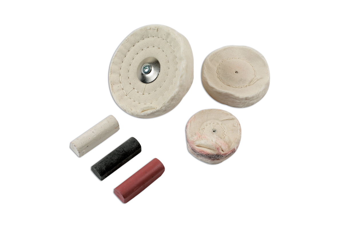 A 7 piece polishing kit for ferrous and non-ferrous metals. Includes 3 coumpound grades of polishing medium.