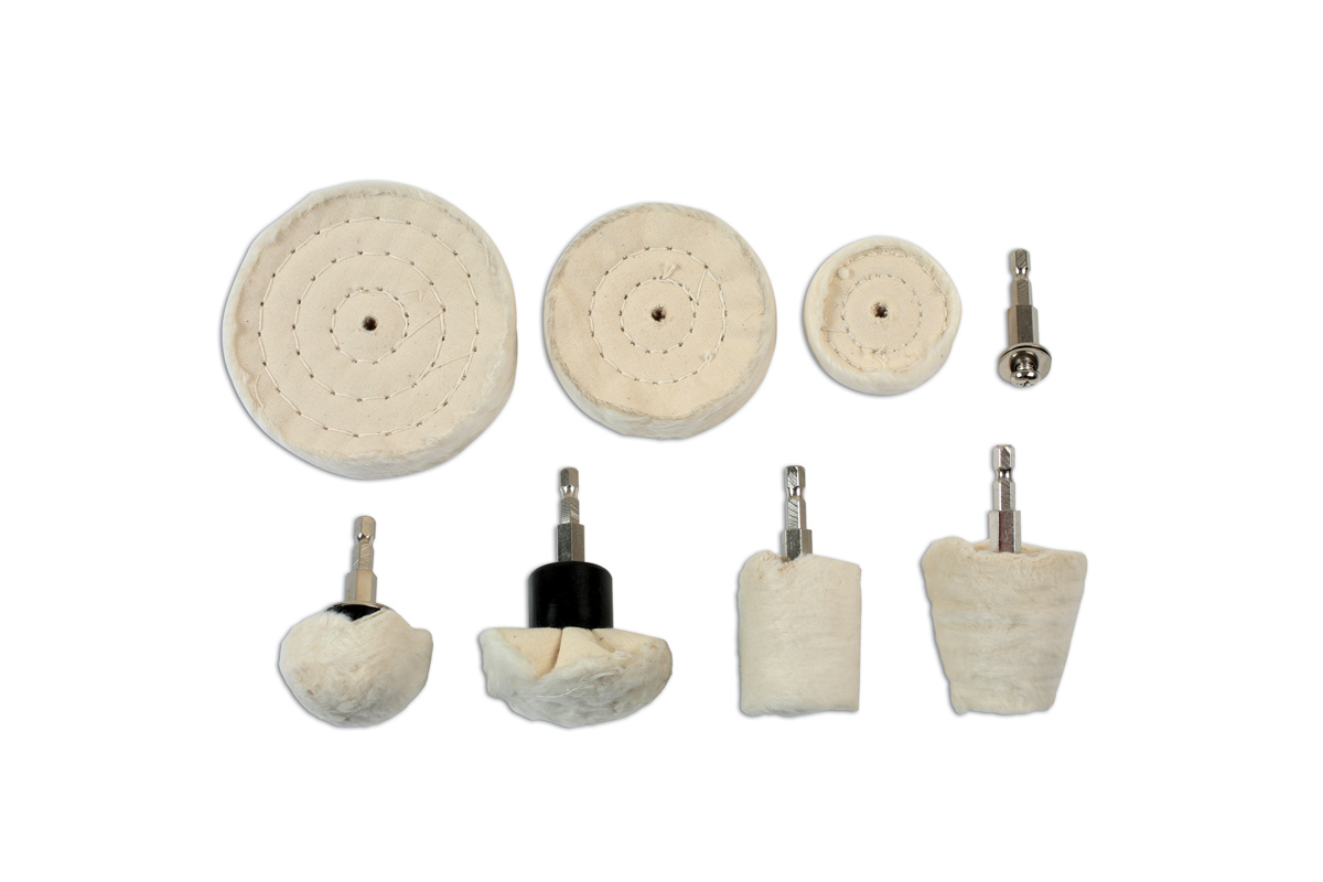 Part of the Laser range for fabrication workshops. An 8 piece metal compound and buffing wheel set.