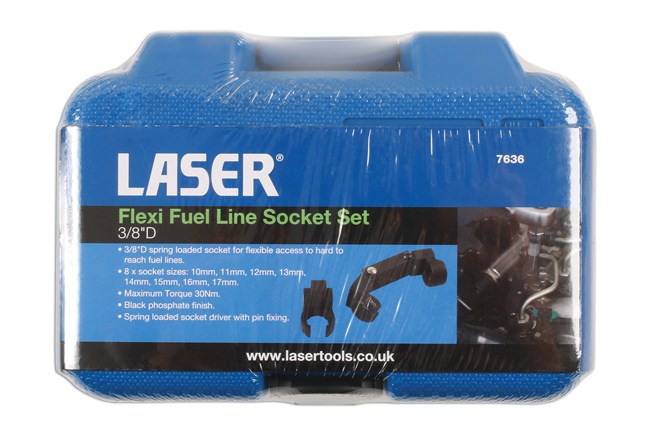 - 3/8"D spring loaded socket set for flexible access to hard to reach fuel lines.